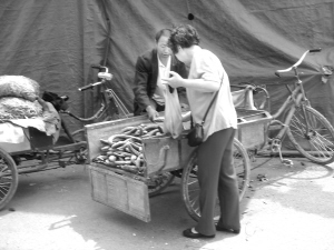 5月19日上午10∶10,六一路上,一位女士拎著塑料袋,正在挑選蔬菜。 記者 范夢博 攝