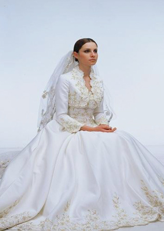 中國的刺繡藝術近年頻頻被用于婚紗設計上,它也成了今冬季婚紗的亮點。刺繡加緞面的婚紗讓人感覺高貴典雅,腰部繡花設計以簡潔、流暢的線條勾勒出新娘優美的曲線;精致的手工刺繡真的讓婚紗開起來隆重而華麗