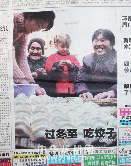 ????創(chuàng)刊號(hào)頭版壓軸圖片《過(guò)冬至,吃餃子》,拍攝的是80多歲的姥姥、50多歲的媽媽、30多歲的媳婦、五六歲的小女孩四世同堂歡天喜地包餃子的場(chǎng)景。媳婦搟餃子皮,姥姥、媽媽包餃子,五六歲的小女孩也來(lái)湊熱鬧,拿起一個(gè)餃子皮學(xué)著大人的模樣包餃子,剛剛包好的一大鍋蓋餃子令人垂涎。特別是按照晚報(bào)的送報(bào)時(shí)間,創(chuàng)刊號(hào)報(bào)紙送到千家萬(wàn)戶時(shí)正好是上午11時(shí)之前,此時(shí)正是人們包好餃子準(zhǔn)備煮餃子的時(shí)間。可想而知,大家一邊品讀屬于周口人自己的晚報(bào)、欣賞和諧家庭歡天喜地包餃子的圖片,一邊把包好的餃子下到沸騰的開水鍋里,那煮出的餃子香味和著晚報(bào)濃濃的墨香,香飄滿城,沁人心脾。