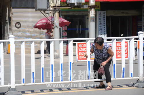 八一大道上,一位大媽從護(hù)欄縫隙中穿過。