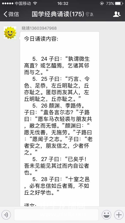 ????建立該微信群的是團(tuán)市委工作人員劉曉靖。劉曉靖告訴周口晚報(bào)記者,建立該微信群的目的是想讓大家多讀讀國(guó)學(xué)經(jīng)典,增加大家的文學(xué)涵養(yǎng),讓大家養(yǎng)成讀書的習(xí)慣。“剛開始只有十幾個(gè)人,大家有些不好意思,有的人覺得自己讀得不好張不開口,我就做一些示范,引領(lǐng)大家誦讀。不久,加入微信群的人多了,通過幾個(gè)人帶動(dòng),大家誦讀的就多了。”劉曉靖說,讀的方式就是大家通過微信的語音功能,讀一些《論語》中的經(jīng)典句子。過了一段時(shí)間,大家對(duì)這種方式越來越認(rèn)可,加入該微信群的人也越來越多,人數(shù)從剛開始的十幾個(gè)人增加到近200人。現(xiàn)在,該微信群里不但有電臺(tái)、電視臺(tái)的專業(yè)主持人,而且有一些學(xué)者。以前拿不準(zhǔn)的字,現(xiàn)在都會(huì)有人講解,大家也有了學(xué)習(xí)對(duì)象。這個(gè)微信群從成立到現(xiàn)在,《弟子規(guī)》、《大學(xué)》、《中庸》、《論語》已讀一遍,四書里面只剩下《孟子》還沒有讀。