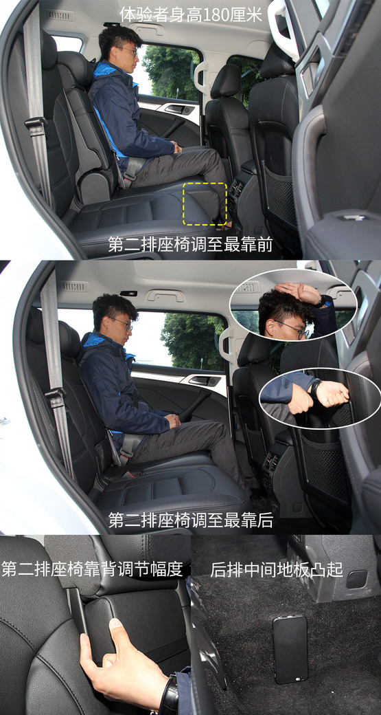 關于第二排,最重要的當然要數空間了。剛一坐到第二排之后,感覺確實是很寬敞,不僅腿部空間毫無壓力,頭部空間也完全沒有壓抑感,而且,第二排座椅還支持四向調節,即座椅前后調節和靠背角度調節,在第三排沒人乘坐的情況下,第二排乘客基本可以找到N種舒服姿勢來應對長途乘坐。只不過,第二排的中間地板凸起較高,一定程度上影響了中間乘客乘坐的舒適度。