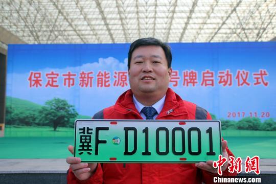 ????中新網(wǎng)保定11月20日電 (呂子豪 于俊亮) 20日,河北省公安廳副廳長(zhǎng)劉云峰將冀FD10001新能源汽車專用號(hào)牌正式頒給保定市民康辰龍。據(jù)悉,該新能源汽車將享受“不限行”的交通管理優(yōu)惠政策。