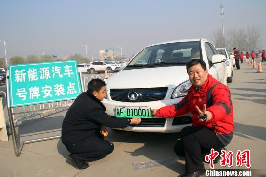 ????保定市民康辰龍領(lǐng)到該市第一副新能源汽車專用號(hào)牌。 于俊亮 攝
