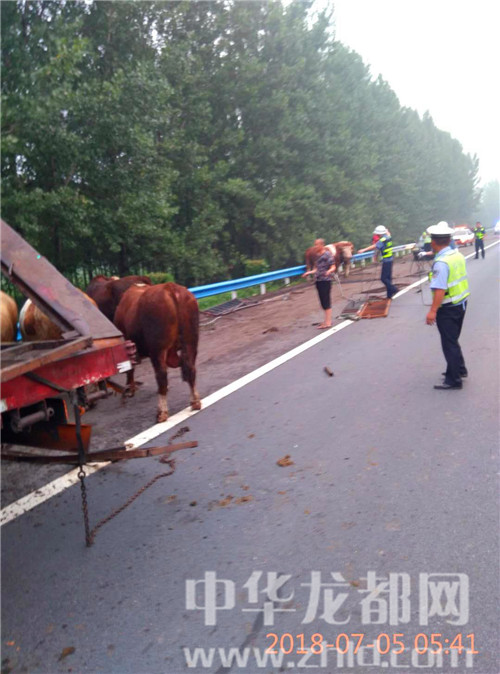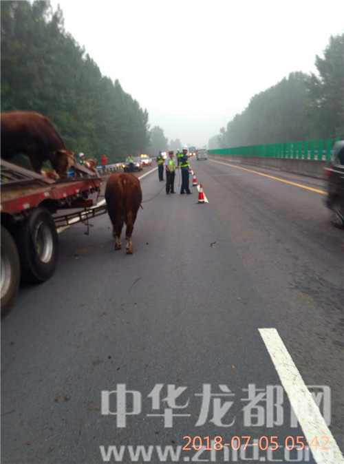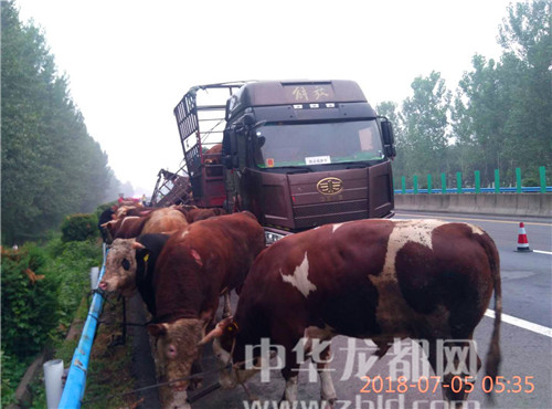 中華龍都網訊(周口報業全媒體記者 姬慧洋 通訊員 劉杰 文/圖)“在大廣高速2025公里西半幅附近發生一起單方事故,幾十頭牛散落在路面,請求處警。”7月5日5時許,周口市公安局交通管理支隊高速二大隊扶溝中隊接到110指令稱。