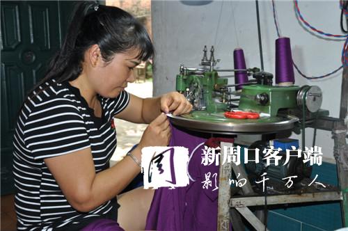 今年以來,商水縣實施精準扶貧,大力發展服裝代加工,讓不能外出打工的貧困群眾從工廠領回設備和原材料在家加工,廠方上門進行技術指導并回收成品。圖為該縣巴村鎮董村村民使用廠方提供的毛衣編織機在家加工羊毛衫。
