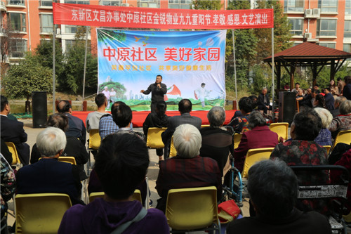 金秋十月,菊花飄香。10月17日重陽節當天,東新區中原社區攜同金銳物業在該社區組織開展了“擁抱新時代 歡度重陽節”文藝演出活動。東新區社會事務局局長朱放哲,房屋征收中心主任閆國政,文昌辦事處主任李向峰,國庫支付中心副主任科員齊孟磊,文昌中學副校長康瑞玲參加活動。