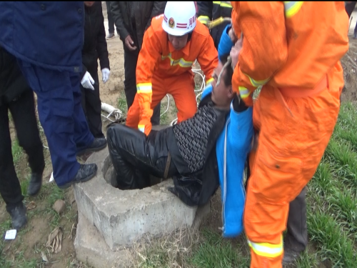 1月14日早上8時許,接到群眾報警后,淮陽縣消防大隊立即出動一輛搶險救援車、一輛水罐車及8名指戰員趕赴救援。到達現場后,民警發現男子掉進一個沒有蓋的澆灌井內,井深約10米,井口直徑大約20公分。