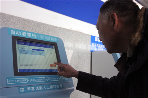 1月20日,旅客在周口火車站自動售票機取票。記者 金月全 攝