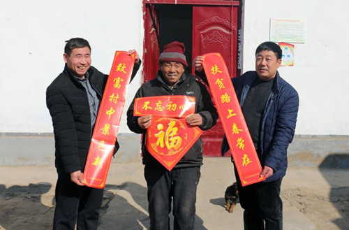 1月24日,扶溝縣白潭鎮王村貧困戶王奎鎖喜滋滋地從縣財政局扶貧工作人員手中接過對聯。為營造歡樂祥和、文明有序的節日氛圍,宣傳扶貧政策,扶溝縣財政局對所幫扶7個行政村開展“情暖萬家·迎新春送春聯”助力脫貧攻堅活動,以此傳達黨的十九大精神和脫貧攻堅精神。