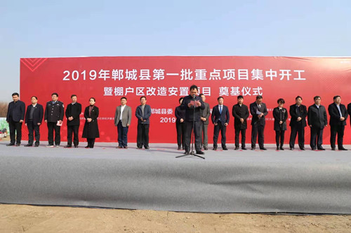3月6日上午,鄲城縣舉行2019年全縣第一批重點項目集中開工暨棚戶區改造安置項目開工奠基儀式。縣委書記羅文閣,河南中原建業城市發展有限公司董事長陳建業,總裁馬驍騰,縣長李全林,縣人大常委會主任李建軍,縣政協主席姜永來,縣委常委、常務副縣長王智華等出席開工儀式。