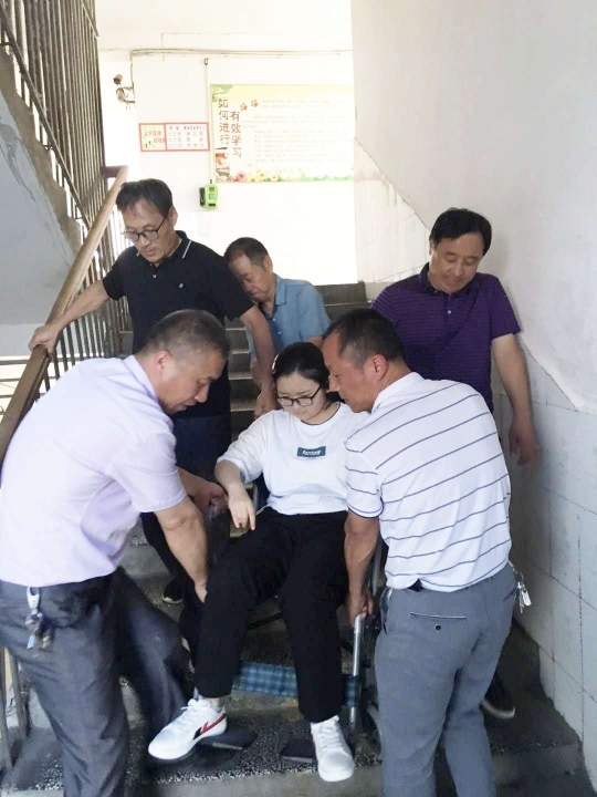 “考慮到她行動不便,我們適當地調整了桌子之間的距離。”羅明中表示,兩天來,晉淼在實驗中學考點服務工作人員的幫助下,從一樓抬進三樓考場。每場考場結束后,考點工作人員又把她從三樓抬下來,推到家長身邊。