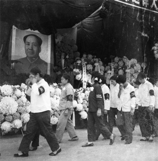 廣播喇叭一直轉播著中央人民廣播電臺的節目,哀樂一遍遍響起,回蕩在大街小巷、城鎮鄉村,大家不約而同地佩戴黑紗,自發做白花、扎花圈、寫挽聯,商店里的白紙和黑布都賣缺了。機關單位的同志在自己布置起來的靈堂里悼念毛主席,學生每天上課之前都向毛主席默哀,工廠里掛起了“繼承毛主席遺志,抓革命、促生產”的橫幅,農民佩戴著黑紗在田野里勞動。
