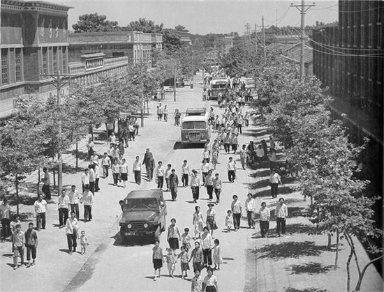 1975年6月,西華縣城唯一的一條硬化路面大街,現在的箕城路。 1975年5月,新華社一名攝影記者來到河南,從鄭州花園口到周口商水、西華、太康、扶溝、淮陽,歷時一個半月采訪拍攝黃泛區現狀。途徑地政府安排當地攝影家與其共同拍攝,周口攝影家葛慶亞、李中華、岳獻甫參與了拍攝。受政治環境影響,這批圖片推遲到1979年才集結成冊,由外文出版社分英文、法文、西班牙文三種語言出版。當時,外文出版社隸屬出版總署,由中共中央宣傳部領導,出版了大量的外宣圖書贈送外國駐華領事館。 (圖片來源:圖書《Former yellow river flood area transformed》中文名《黃泛區變化》)