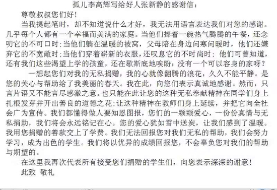 為表示對張新靜等人大代表的感謝,隨后,李高輝給張新靜寫了一封感謝信。信中,他表示,自己一定不辜負大家的期望,以后會更加努力學習,回饋社會,回報大家。“他是一個懂得感恩的孩子,讀了他的來信,我感到很欣慰。”張新靜說。