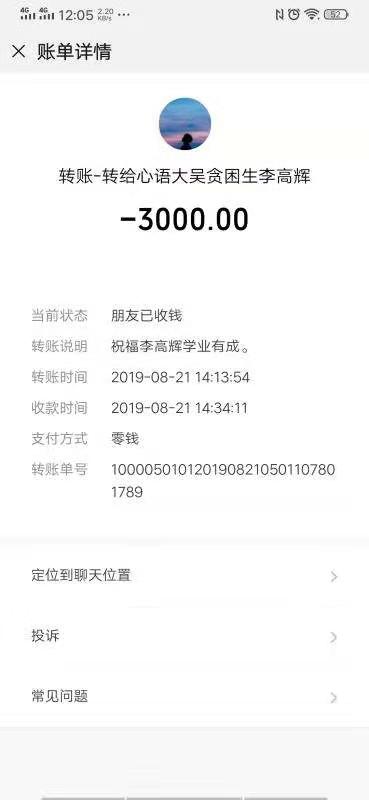 “今后,在學習和生活上無論遇到什么困難,只管給我們說,我們會隨時幫助你解決。”張新靜在與李高輝聊天中再三叮囑李高輝說。隨后,他通過微信給李高輝轉來3000元學費。