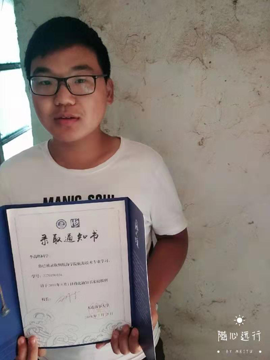 據了解,李高輝是一個命苦的孩子,很小的時候父親因病去世,母親改嫁,無奈,他只好跟隨年邁多病的爺爺奶奶一起生活,家庭十分拮據。俗話說,窮人的孩子早當家。李高輝從小學就知道勤奮學習,養成了不懼困難,愛幫助別人的性格,深受師生喜愛。經過10多年努力拼搏,2019年高考,他以優異的成績被大連海事大學航空學院錄取。