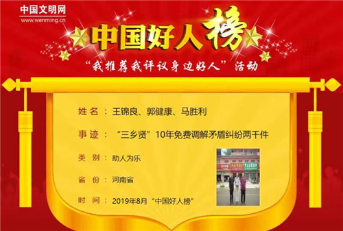 太康縣王錦良、郭健康、馬勝利在楊廟鄉(xiāng)成立幸福調(diào)解室,10年調(diào)解矛盾兩千件,成為各界美談。9月2日,8月份中國(guó)好人榜發(fā)布,該縣楊廟鄉(xiāng)幸福調(diào)解室“三鄉(xiāng)賢”同時(shí)榮登中國(guó)好人榜。截至目前,該縣入選“中國(guó)好人榜”已達(dá)60人。