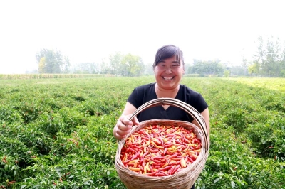 在朱樓行政村,朱高杰、王麗夫妻倆正帶領20多名采摘工人在辣椒田里采摘艷紅、泡椒兩個品種,地頭停放著盛滿辣椒的三輪車和五六個蛇皮袋,火紅的辣椒映襯著小兩口臉上燦爛的笑容:“大豐收呀,這塊地是泡椒,還沒有出地頭,就劃3.8元一斤了,走向市場至少五六元錢。咱吃的泡椒鳳爪、泡椒罐頭,都是這做的。像那塊地的艷紅,就像它的名字一樣又紅又鮮艷,出地頭就得七八塊,賣到市場上都10多元一斤,主要賣到四川、湖北等地,這是火鍋底料、炒菜的必備品,這是個炒出來有香味的辣椒品種。”王麗能說會道,而且在她的帶動下,全鄉許多親朋好友都在種植辣椒。像王麗一樣,汲水鄉種植辣椒面積突破了1萬畝,整個鄲城縣種植辣椒突破5萬畝。