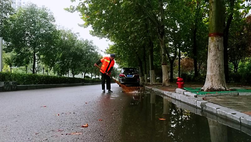 連續幾日的陰雨結束后,10月7日一大早,環衛工人們就開始清理中心城區道路上的積水和落葉,為我市“創衛”工作貢獻一份力量。
