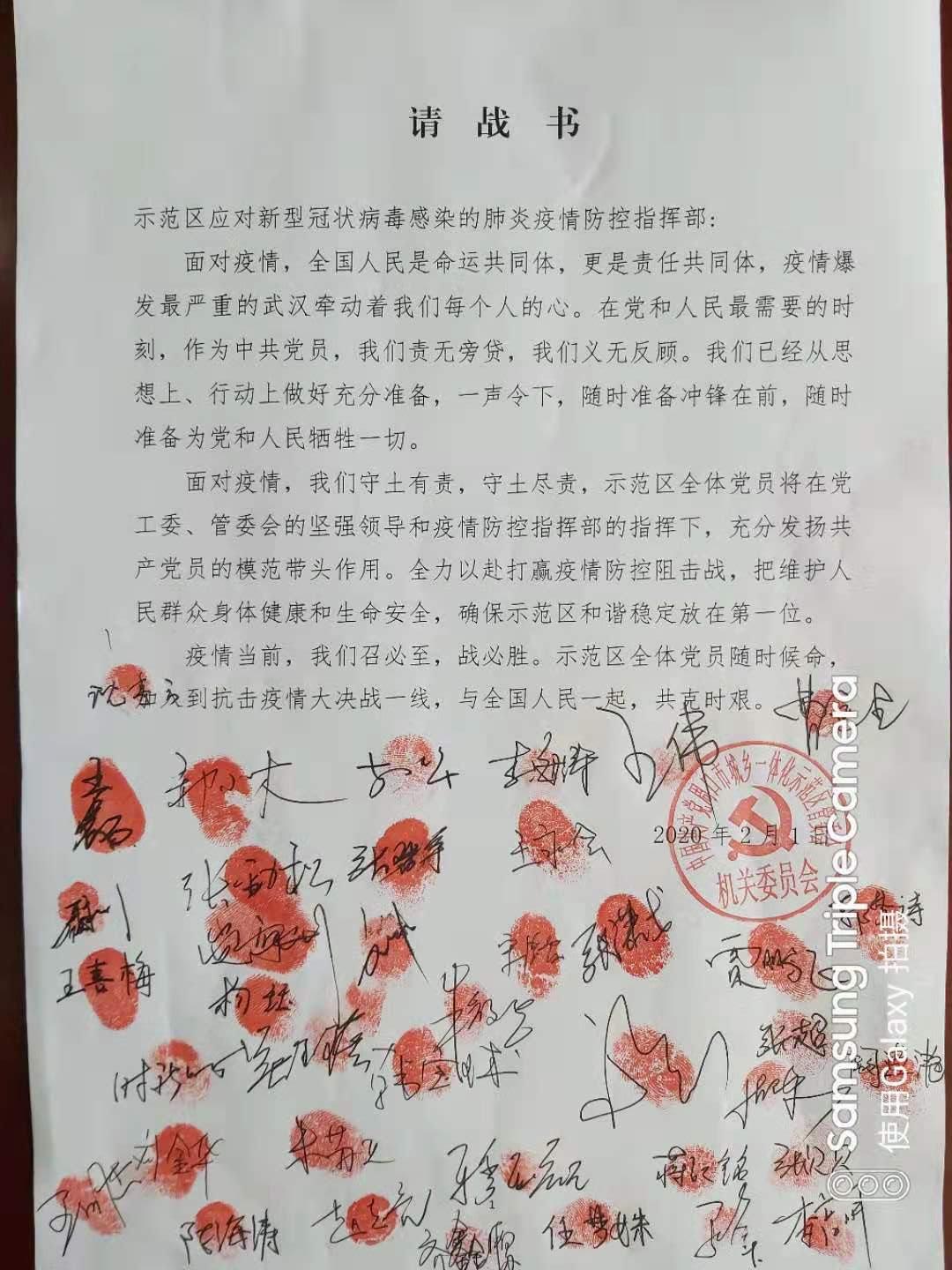 為了能到戰“疫”一線,示范區廣大黨員干部紛紛簽下“請戰書”,自愿要求加入到抗擊新型冠狀病毒感染的肺炎疫情戰斗中去?!罢垜饡鄙希麄兗娂姲聪迈r紅的指印,在指印下面,是每個黨員堅定的簽名,從這些指印和簽名可以看出每個黨員堅定的黨性和為了抗擊疫情大無畏的英雄氣概。