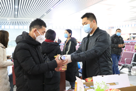 現場,外出務工人員們戴著口罩遮了大半張臉,但是舉手投足難掩興奮。他們在服務臺掃碼進行電子證明注冊,填寫登記表。工作人員給他們送上了方便面、火腿腸、飲料等途中需要的“干糧”,力求為返崗務工人員提供周到的服務。“非常感謝政府為我們考慮得這么周到,我們外出務工一定好好工作,不辜負家鄉人民的厚望。”來自許灣鄉的李振俊對記者說。