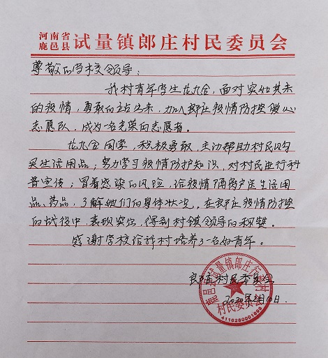 “龍九合同學積極勇敢,主動幫村民購買生活用品,努力學習疫情防護知識,對村民進行科普宣傳,冒著感染的風險給疫情隔離戶送生活用品、藥品,在我村疫情防控的戰役中表現突出,得到村鎮領導的稱贊,感謝學校給我們培養了一名好青年……”這是一封要寄往周口師范學院的感謝信,落款為鹿邑縣試量鎮郎莊行政村村民委員會。