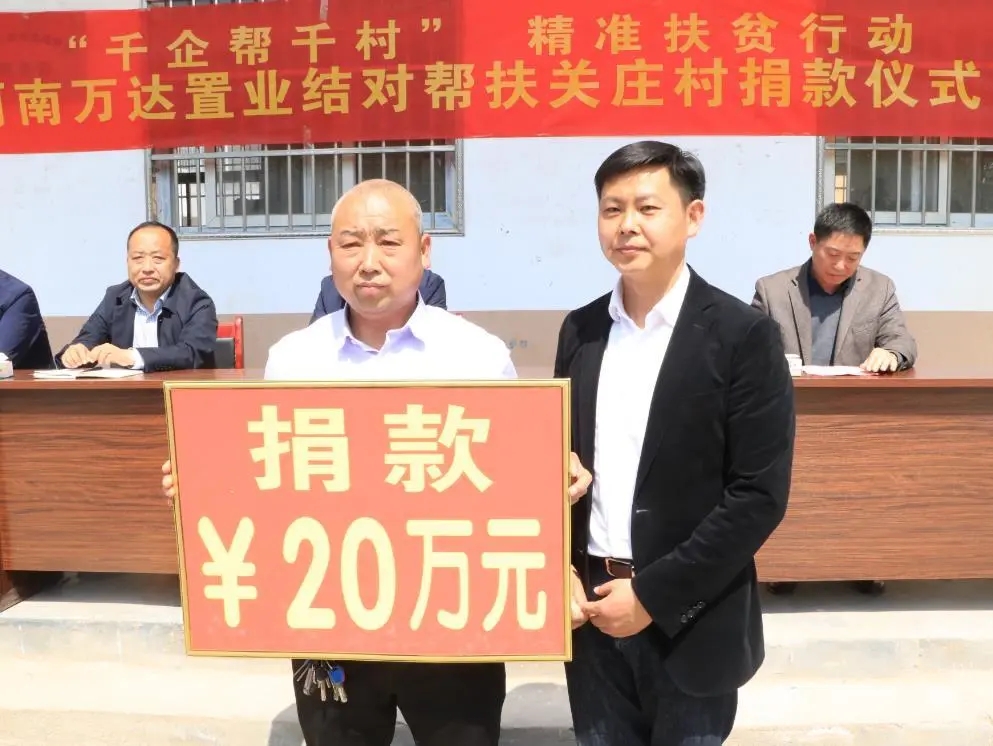 4月13日上午,河南萬達置業有限公司結對幫扶捐款儀式在市城鄉一體化示范區許灣鄉關莊行政村隆重舉行?,F場,該公司為關莊行政村捐款20萬元助力脫貧攻堅。