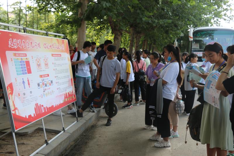 在該縣各標準化高考考點征兵宣傳現場,人頭攢動、熱鬧非凡?!昂媚袃?,來當兵”大紅條幅和“把忠心獻給祖國,把青春獻給軍營”“參軍報國盡義務,熱血青年競風采”的大型宣傳牌格外引人注目,內容豐富的征兵宣傳展板一字排開,《征兵宣傳手冊》《大學新生應征入伍宣傳單》《征兵政策宣傳解讀手冊》等征兵宣傳資料擺放在咨詢臺上一目了然,吸引了眾多的考生和家長駐足觀看,圍著咨詢臺詢問有關征兵事宜。