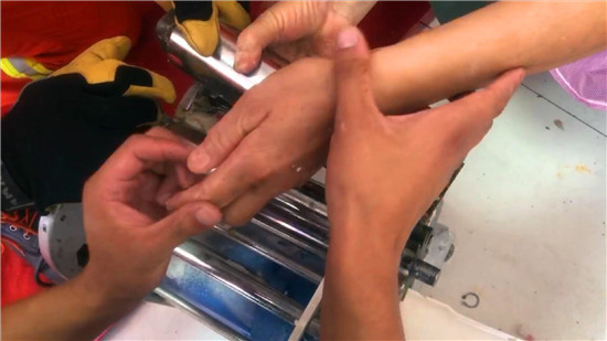 到達現場后,救援人員發現后廚一名女店員的右手小拇指被緊緊夾在壓面機里,由于疼痛難忍,女子情緒非常不穩。由于救援空間狹小,為了確保安全,救援人員用螺絲刀、扳手等工具對機器外部進行拆解。拆解后,救援人員利用破拆工具組對壓面機滾軸進行擴張,把夾住被困人手掌的滾軸分離?!芭椤钡囊宦暎瑝好鏅C的滾動軸松開了一條縫,救援人員成功把女店員的手從擴張后的壓面機滾軸縫隙中抽出來,并迅速移交給現場醫務人員。