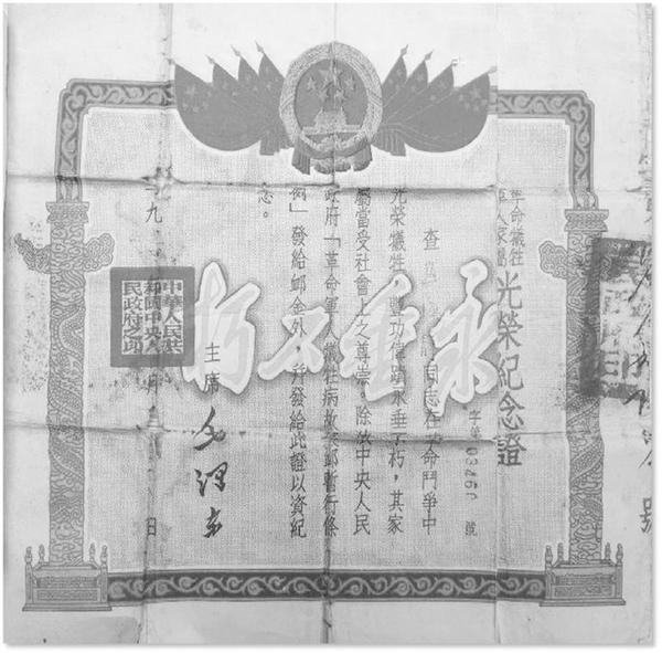 中央人民政府頒發(fā)的趙海靜烈士紀念證
