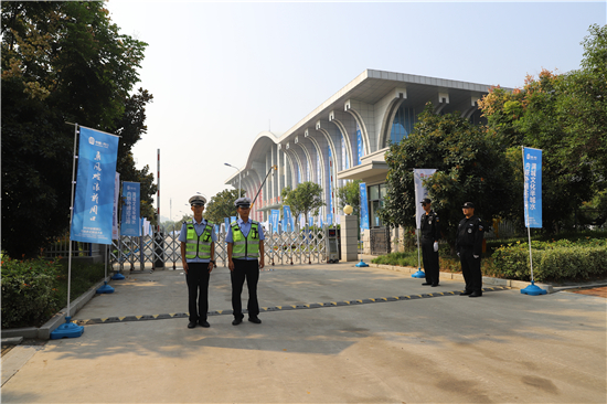 公安民警和安保人員在主會(huì)場(chǎng)外做好安保演練