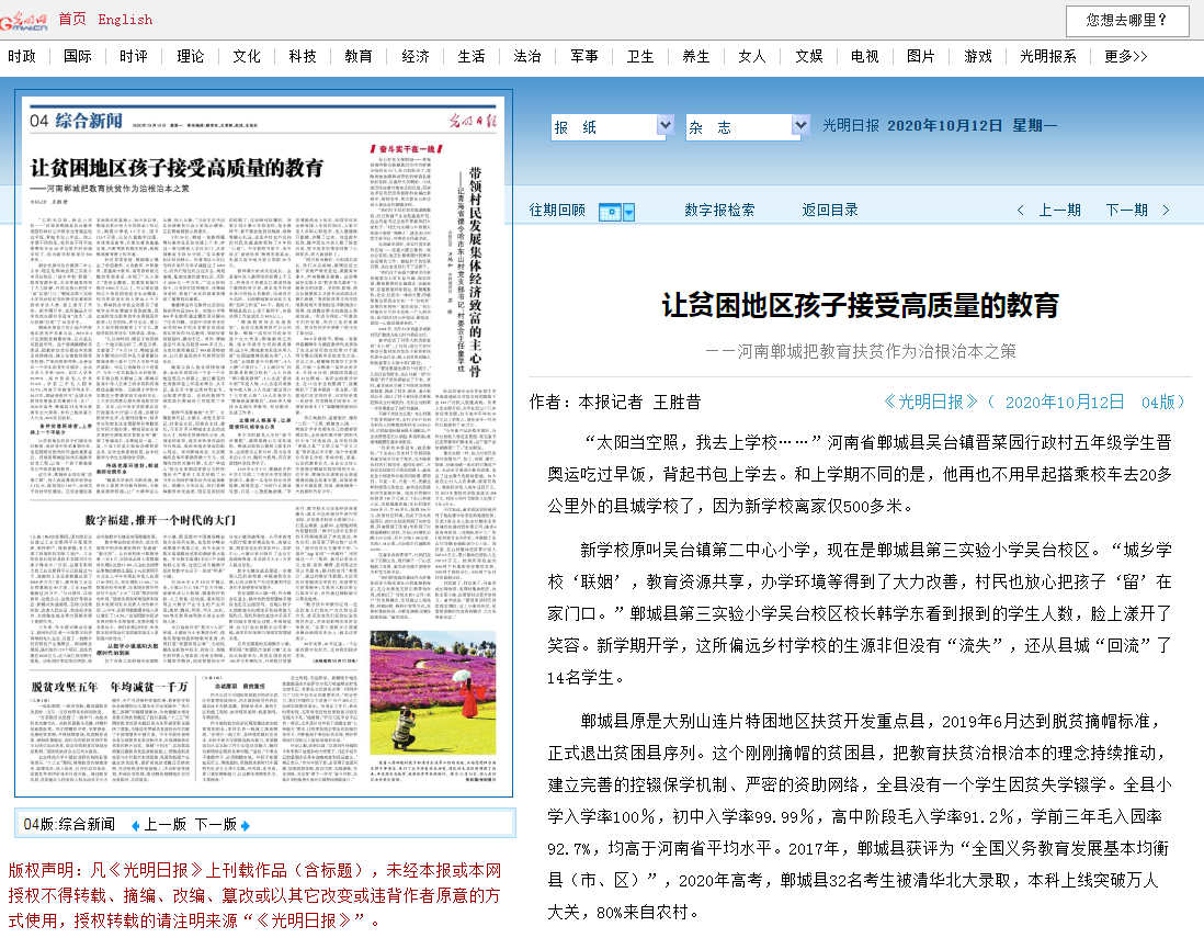 今天(2020年10月12日)出版的《光明日報》綜合新聞版,以頭條顯著位置刊登《讓貧困地區(qū)孩子接受高質(zhì)量的教育——河南鄲城把教育扶貧作為治根治本之策》,對鄲城教育成果進行了詳細(xì)而深入的報道,這里全文轉(zhuǎn)載,以饗讀者——