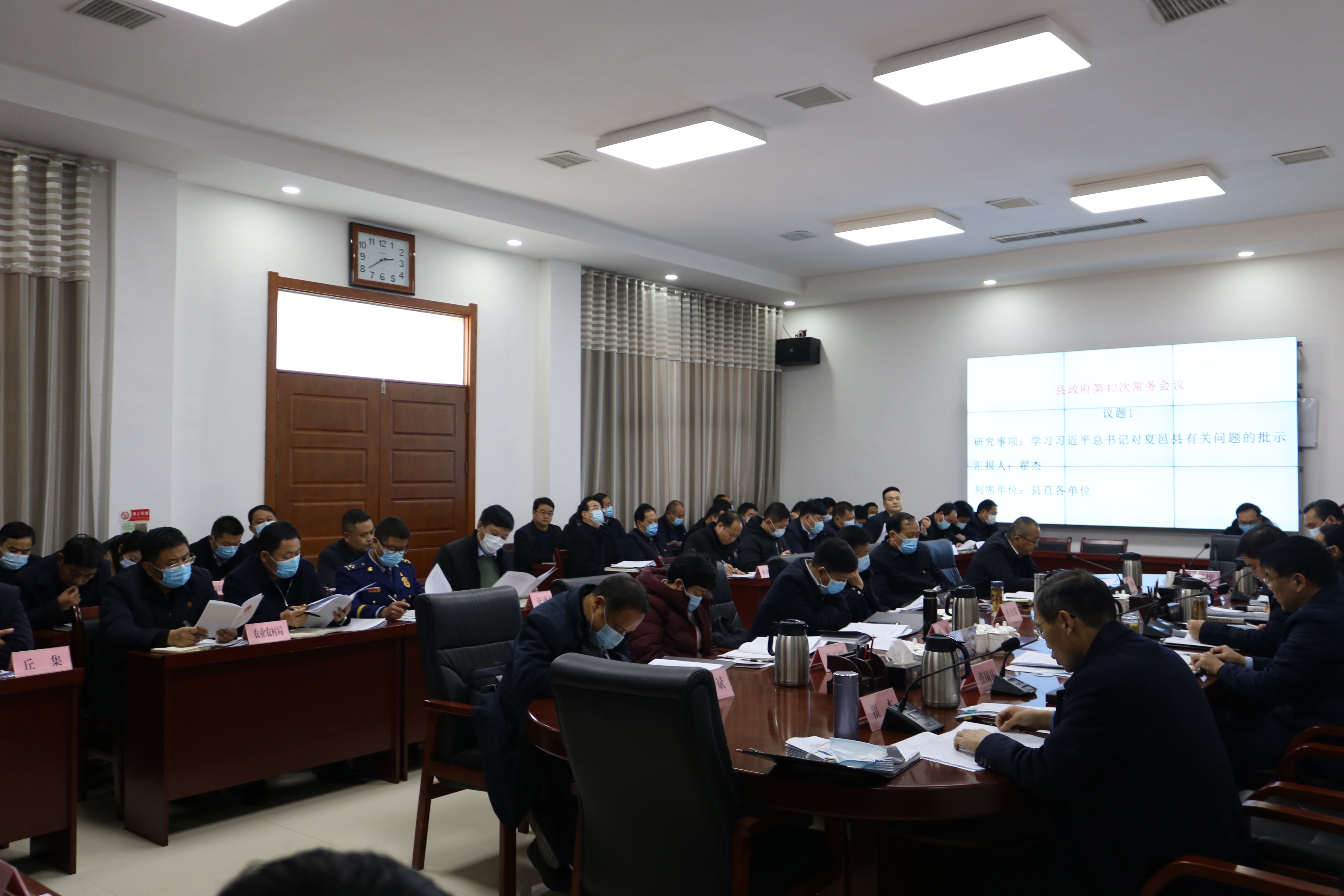 會議先后傳達學習了習近平總書記對夏邑縣有關問題的批示精神、中央經濟工作會議精神;學習了關于我省黨政代表團赴上海、江蘇、浙江學習考察情況的報告以及河南省消防安全責任制實施辦法;聽取了關于2020年民生實事完成情況的匯報、關于政府系統落實省委巡視整改工作情況的匯報、關于鹿邑縣2020年環保攻堅工作情況匯報、關于鹿邑縣2020年安全生產工作情況匯報、關于鹿邑縣秋冬季新冠肺炎疫情防控工作匯報、關于成立鹿邑縣林業生態發展有限公司的匯報、關于引江濟淮工程棄土處置問題的意見匯報。