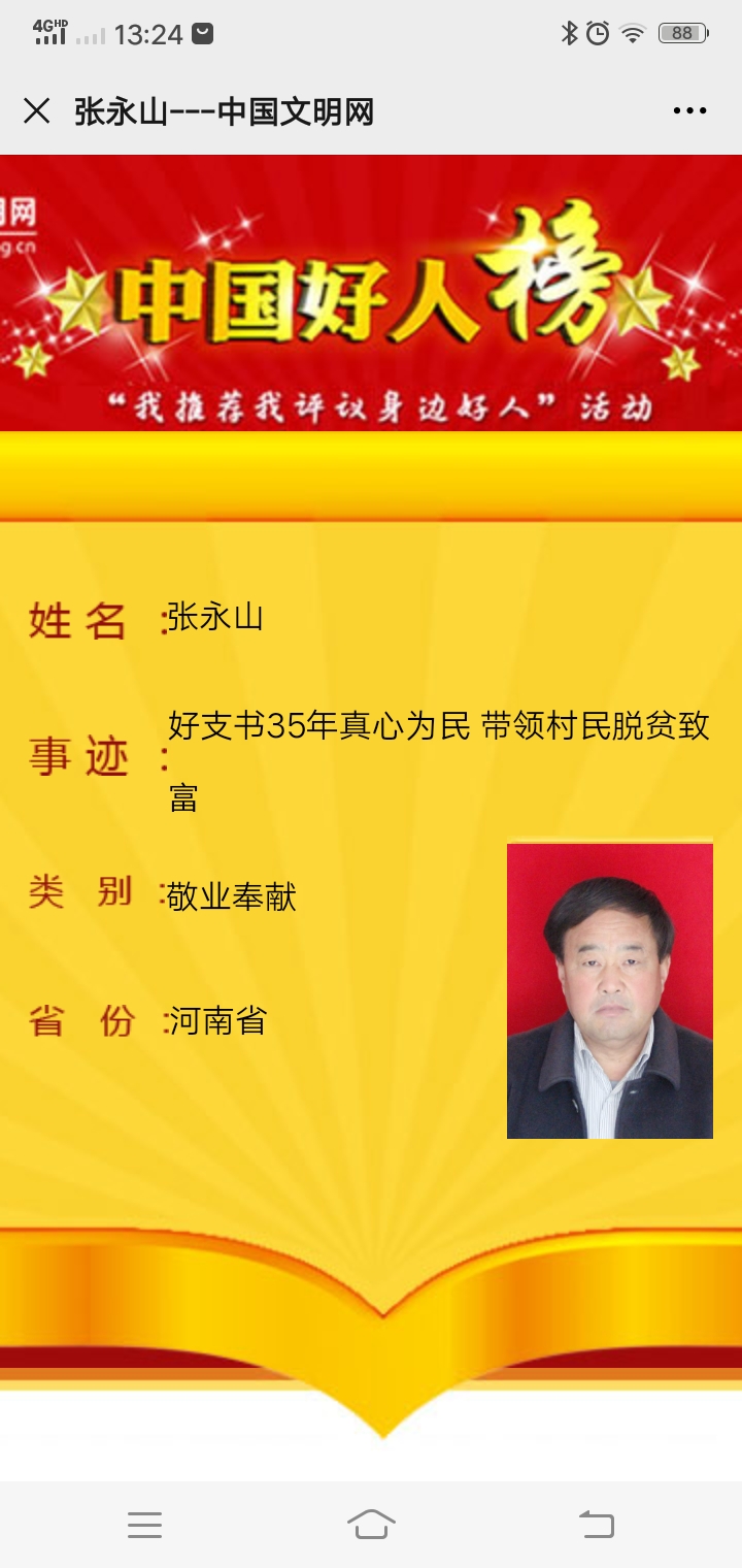 太康縣楊廟鄉(xiāng)祁樓行政村村民張永山被選舉為太康縣祁樓行政村支部書(shū)記,他在這個(gè)位置上干了35年。幾十年來(lái),他鞠躬盡瘁為村民謀實(shí)惠辦實(shí)事,把自己的青春熱血都獻(xiàn)給了農(nóng)村這片熱土。12月29日,記者從太康縣文明辦獲悉:張永山榮登“敬業(yè)奉獻(xiàn)”類(lèi)“中國(guó)好人榜”。