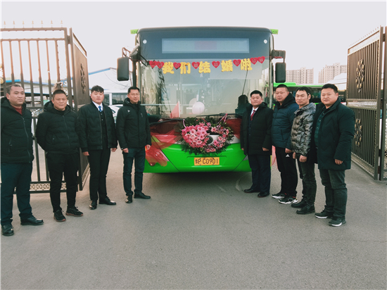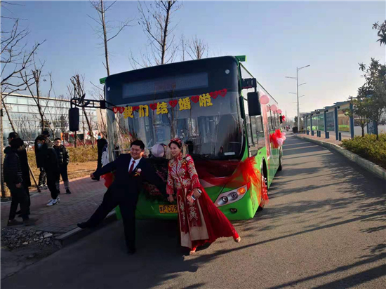 1月1日早上,裝飾一新的6輛迎親公交車吸引了眾人的目光。周口公交一公司19路公交車司機(jī)、新郎買亞飛用公交車,迎娶同為公交車司機(jī)的新娘裴丹陽,被當(dāng)作婚車的公交車為新能源車,正是新郎和新娘平時(shí)駕駛的19路和9路公交車,以及15路公交車。整個(gè)婚禮,親朋好友都是乘坐公交車趕往婚禮現(xiàn)場,環(huán)保又有新意。