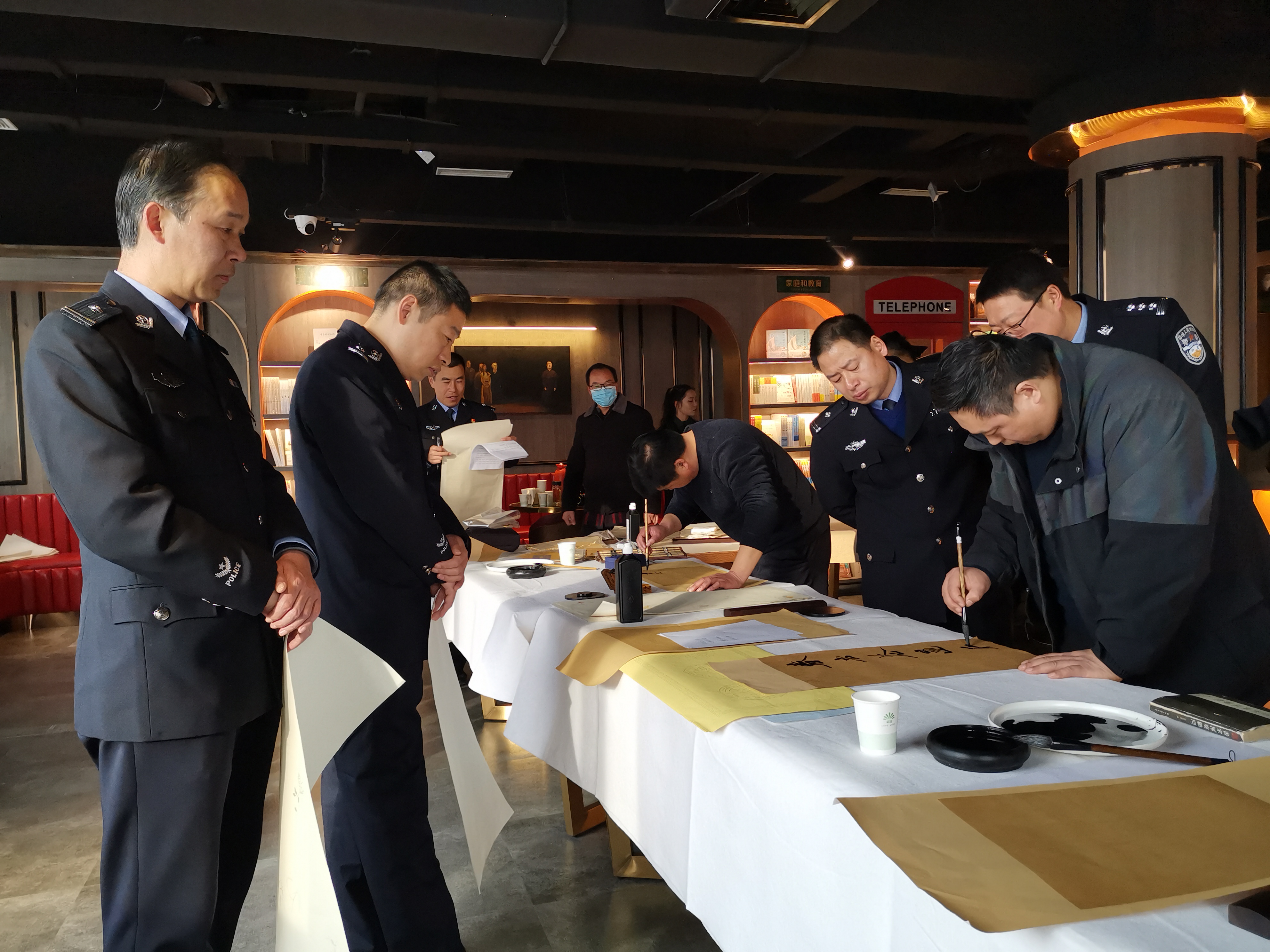活動現場,氣氛熱烈,書法家們現場揮毫潑墨、筆走龍蛇,帶著喜迎牛年的美好祝愿。民警、輔警爭相圍觀,觀看、揣摩書法家們蒼勁有力的書法作品,房間內洋溢著濃郁的節日氣息。