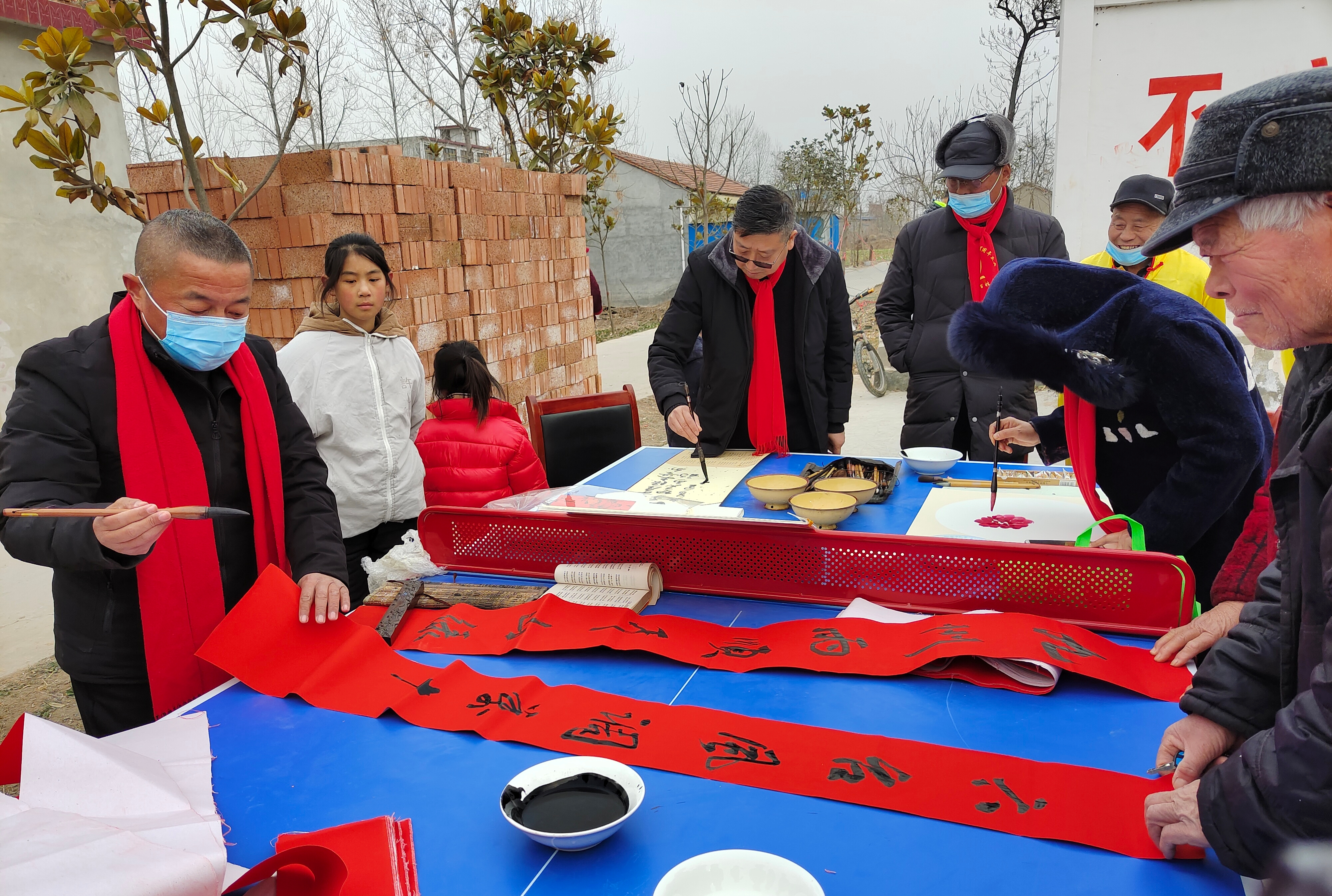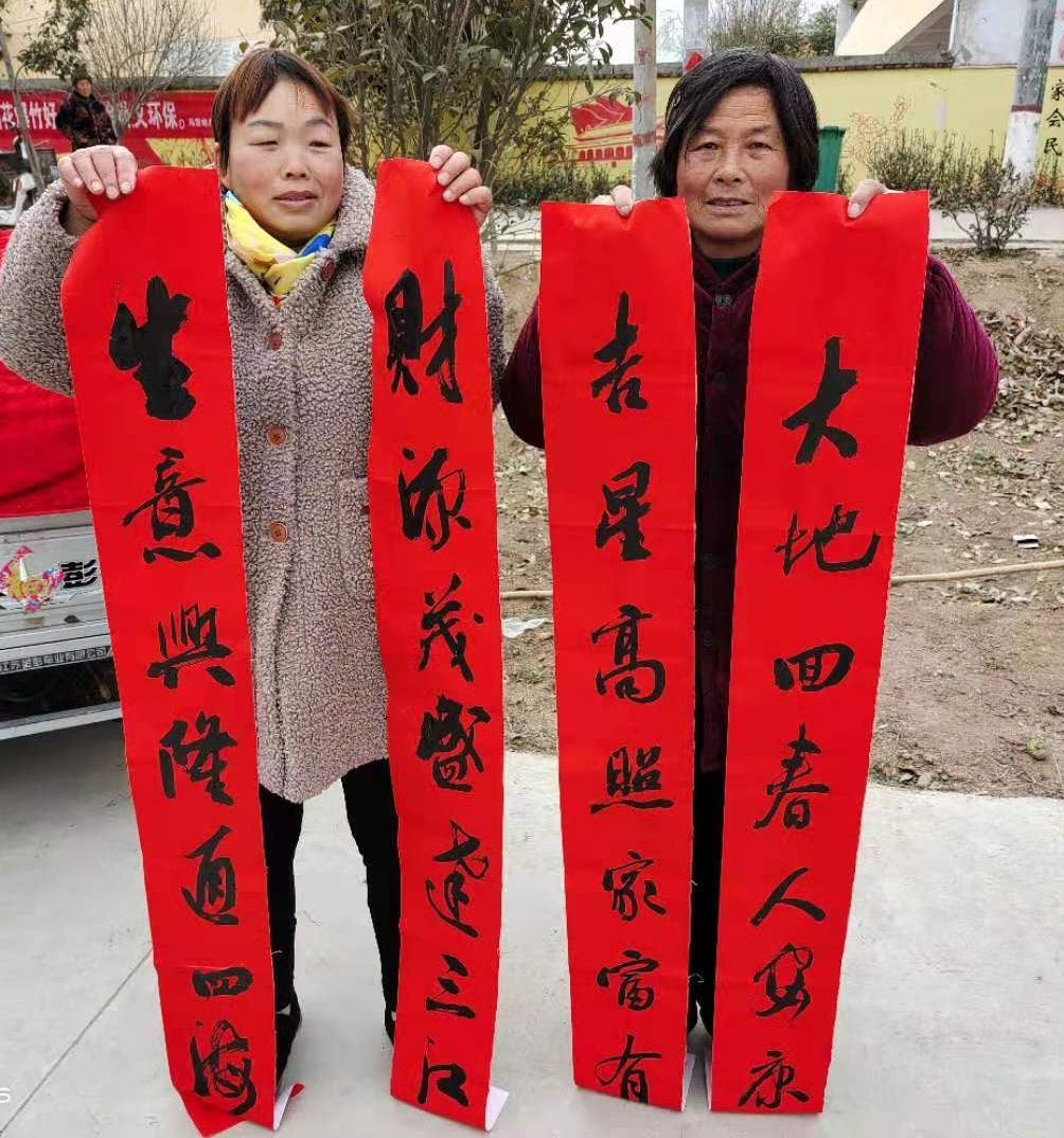 活動現場,沈丘縣文化館副館長孫曉鳳、沈丘籍書畫家竇中亮、李小建等4名書法家,個個熱情高漲,揮毫潑墨寫下一副副充滿暖意的春聯。村民們爭相圍攏在一起,欣賞著、輕聲交談著……