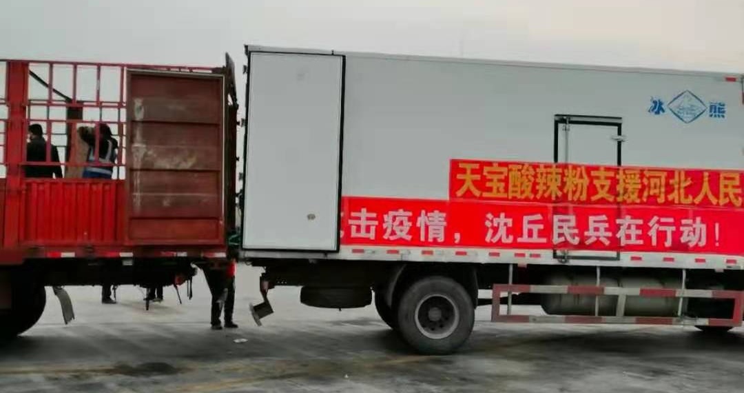 于是,他當即與河北省南宮市相關防疫部門取得聯系,天宮那邊欣然接受,并表示感謝。1月20日當夜,便組織召集村上的“鐵桿工人”連夜加班加點生產了價值5萬元共計1萬盒“天寶酸辣粉”,無償捐贈給河北天宮市,送去來自沈丘縣中豫天寶食品有限公司的一片愛心。