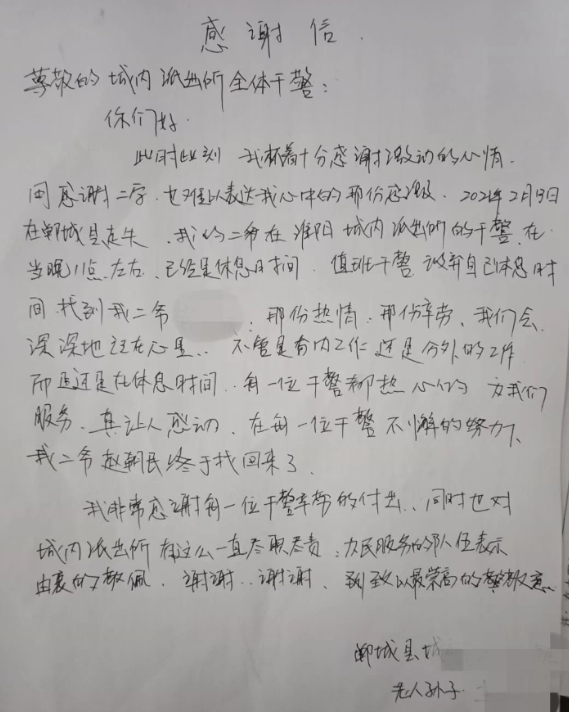 家屬告訴民警,老人去年剛做完手術,身體存在一點問題。民警告知老人家屬今后要看管好老人,謹防走失,并為老人建立易走失人員檔案,以備兄弟單位使用,老人家屬對城內派出所表示感謝并寫了一封感謝信。