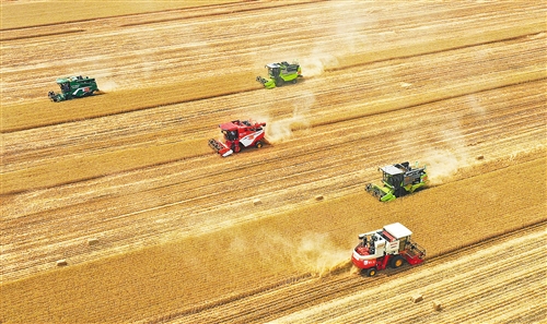 開封市尉氏縣邢莊鄉(xiāng)府李莊村,農(nóng)機(jī)服務(wù)隊幫助村民收獲小麥。 李新義攝(中經(jīng)視覺)