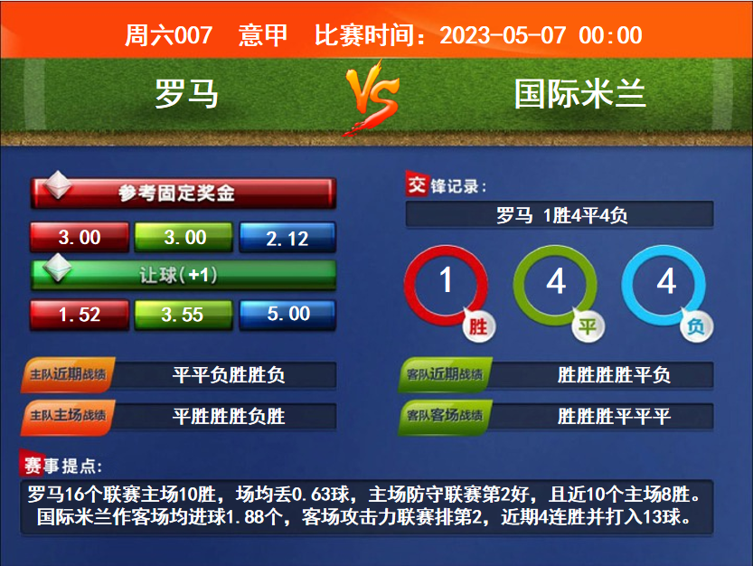比賽時間:2023-05-07 00:00賽事提點:羅馬16個聯賽主場10勝,場均丟0.63球,主場防守聯賽第2好,且近10個主場8勝。國際米蘭作客場均進球1.88個,客場攻擊力聯賽排第2,近期4連勝并打入13球。