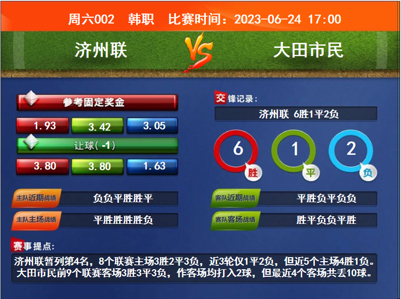比賽時間:2023-06-24 17:00賽事提點:濟州聯暫列第4名,8個聯賽主場3勝2平3負,近3輪僅1平2負,但近5個主場4勝1負。大田市民前9個聯賽客場3勝3平3負,作客場均打入2球,但最近4個客場共丟10球。