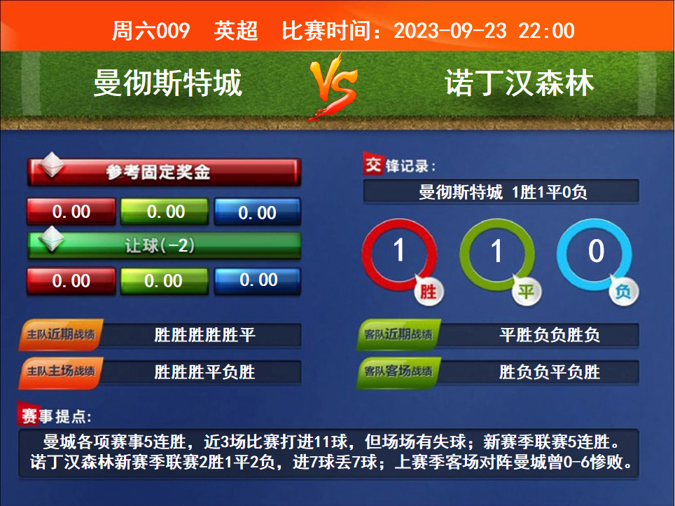 比賽時間:2023-09-23 22:00賽事提點:曼城各項賽事5連勝,近3場比賽打進11球,但場場有失球;新賽季聯賽5連勝。諾丁漢森林新賽季聯賽2勝1平2負,進7球丟7球;上賽季客場對陣曼城曾0-6慘敗。