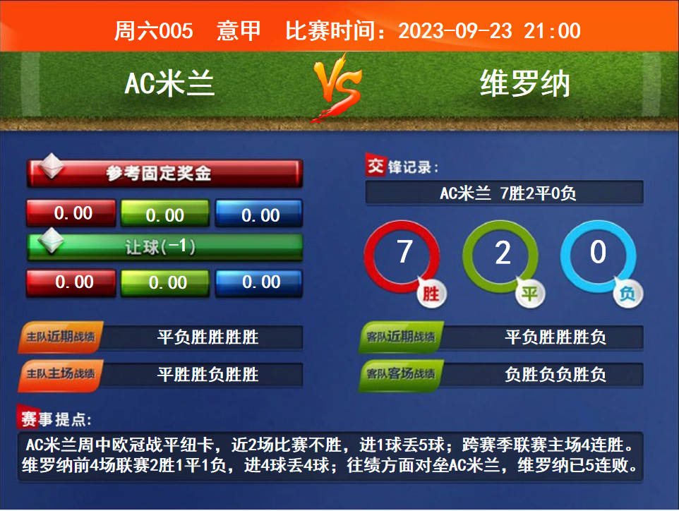 比賽時間:2023-09-23 21:00賽事提點:AC米蘭周中歐冠戰平紐卡,近2場比賽不勝,進1球丟5球;跨賽季聯賽主場4連勝。維羅納前4場聯賽2勝1平1負,進4球丟4球;往績方面對壘AC米蘭,維羅納已5連敗。