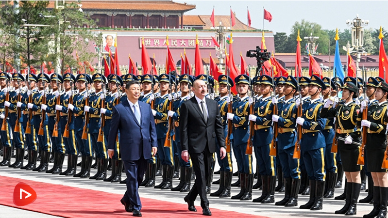 阿利耶夫抵達時,禮兵列隊致敬。習近平同阿利耶夫登上檢閱臺,軍樂團奏中阿兩國國歌,天安門廣場鳴放21響禮炮。阿利耶夫在習近平陪同下檢閱中國人民解放軍儀仗隊,并觀看分列式。