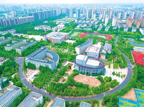 六月二十四日上午,鳥瞰周口師范學院校區,曲折小道環抱音樂廳、大禮堂、圖書館等建筑,宛若一把巨大的琵琶,在中心城區奏響文明發展進行曲。