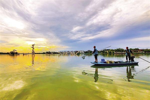 8月13日,當第一縷晨光穿過云層,水云間的淮陽萬畝龍湖景色怡人。此時,一艘打撈船也開始“搜尋”湖面漂浮的垃圾。正在晨練的一位市民說:“正是環衛工人日復一日、年復一年默默無聞的工作,才換來我們身邊美好的生活環境,他們才是最美的風景?!庇浾?杜欣 攝