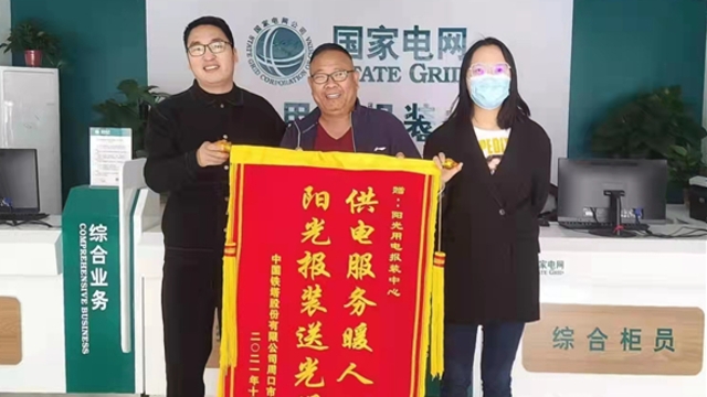 近日,在國網周口供電公司陽光報裝中心,中國鐵塔股份有限公司周口分公司業務經理朱義嶺一邊將印有“供電服務暖人心 陽光報裝送光明”的錦旗遞給供電工作人員,一邊感謝該公司對鐵塔基站建設提供的支持。