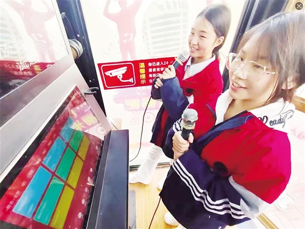 兩名女生利用課余時間在校園KTV唱吧內放聲歌唱。